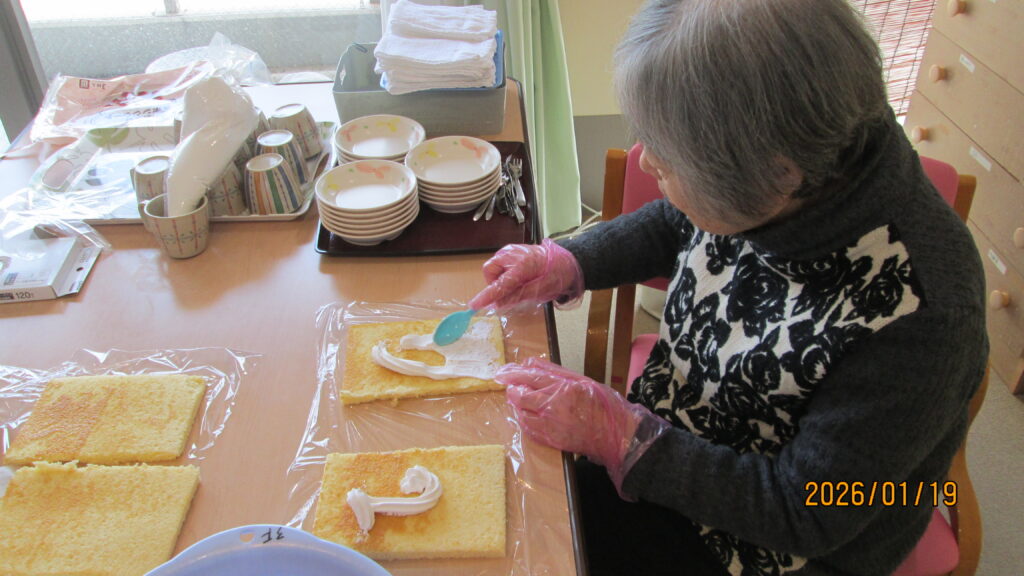 1月の『おやつレクリエーション』を行いました。 令和8年1月19日 1月の『おやつレクリエーション』 を行いました。 今回は 『デコレーションケーキ』を ご利用者様に作って頂いて、 召し上がって頂きました。