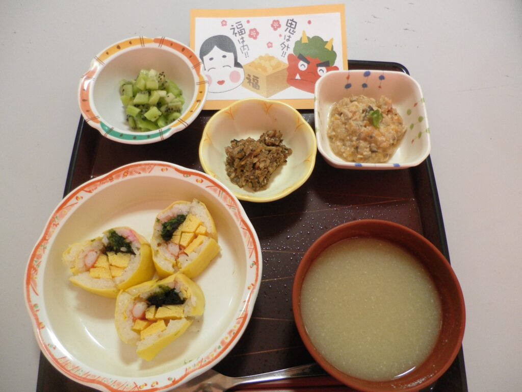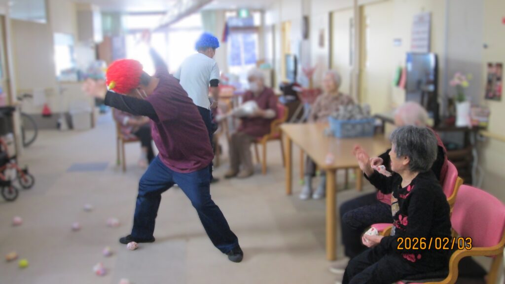 『節分(豆まき)レクリエーション』を行いました。 令和8年2月3日 『節分(豆まき)レクリエーション』を行いました。 鬼に扮した職員に対し、福豆に模した玉を投げつけたり、鬼の持つ金棒を奪い取って、 鬼を懲らしめ、見事、二人の鬼を退治してくださいました。 皆さん、「鬼は外!!、鬼は外!!!」と大きな声を出し、 鬼が退散する様子に、大きな笑い声がフロアに響きました。 節分にちなんで、恵方巻を模した 昼食ではお寿司を、オヤツにはロールケーキを召し上がって頂きました。 OLYMPUS DIGITAL CAMERA